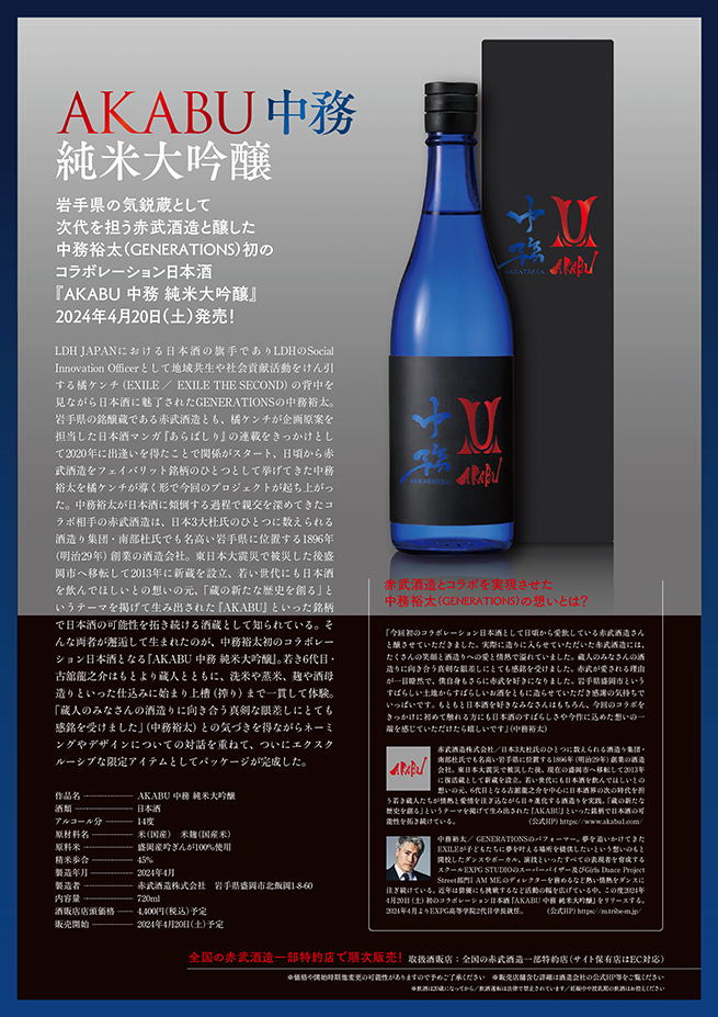 AKABU 中務 純米大吟醸 (岩手県盛岡市) GENERATIONSの中務裕太さんとの初のコラボレーション日本酒。 赤武酒造6代目、古舘龍之介氏や蔵人とともに、 洗米や蒸米、 麹や酒母造りといった仕込みに始まり 上槽(搾り)まで、 実際に蔵に入り一貫して造りに携わりました。